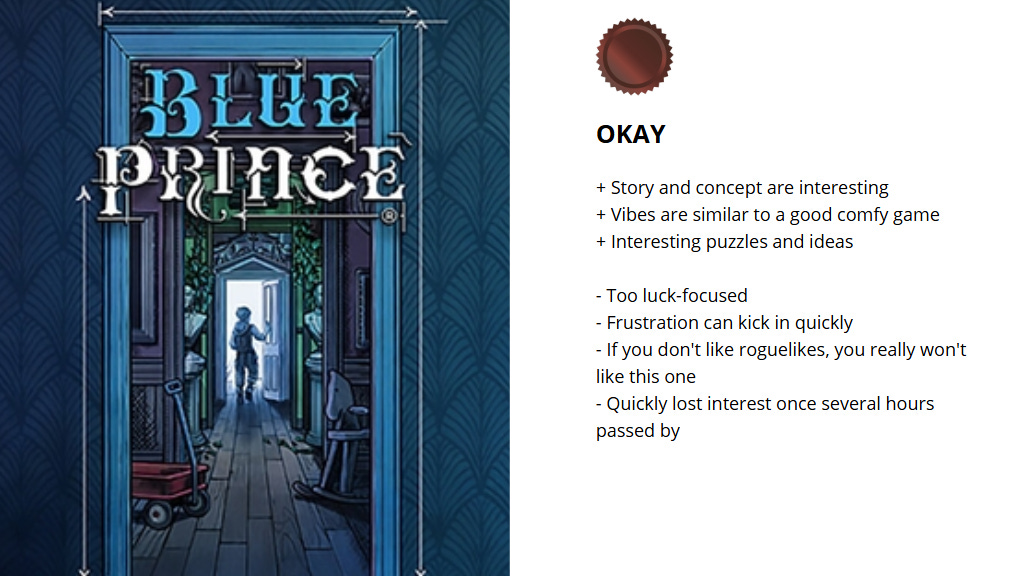 Blue Prince has a unique concept and gets the mystery solver out of you. The puzzles are unique, the vibes are solid, and the first hour-plus feels like you’re discovering so much. However, this is ultimately a roguelike, a genre I’m not crazy about. As I continued playing, I became increasingly frustrated, and after several days of sessions, I ultimately quit in frustration. However, I can’t deny that I did have some fun with it before the frustrations set in, and I acknowledge this isn’t my genre. If you like roguelikes, I would recommend this for you, but for me and the others who aren’t as crazy about it, I would say this game is okay at best. I wouldn’t say it’s a bad game; it just wasn’t ultimately for me, but it could be for you, depending on your gaming tastes.