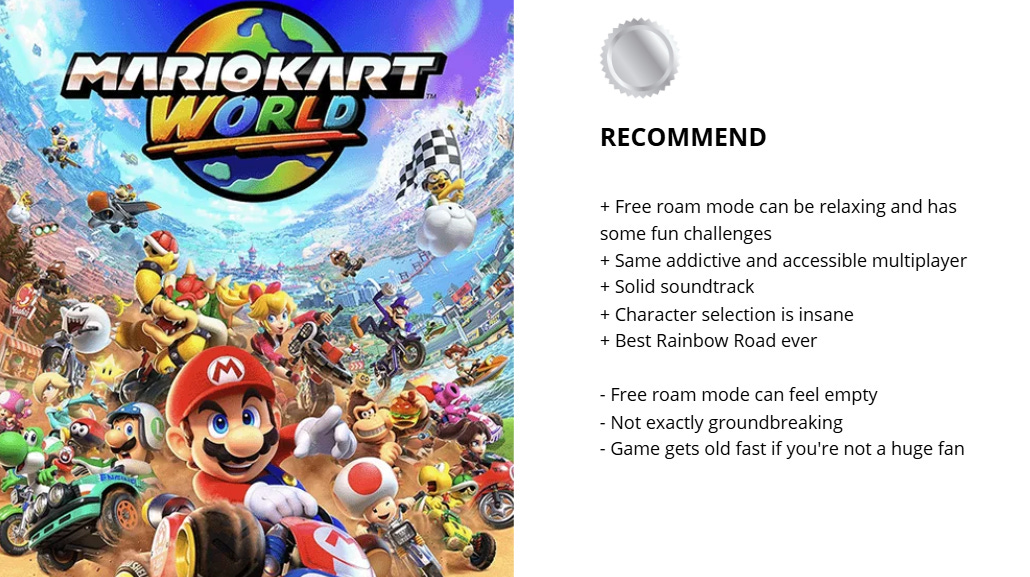 So, look, this is a super fun game that's best played with family and friends, and its free-roam mode can be relaxing and enjoyable - but in many ways, and I mean this with respect, this is still just another Mario Kart. Yes, it does feel like a version of the game on steroids, has an insane roster, great music, and fun tracks - but if you’re not into Mario Kart, this one won’t change your perspective. The free-roam mode, while interesting, can feel empty at times, especially if you stay in the same area for an extended period. If you’re a single-player person like me, once you get the cups out of the way, you’ll be okay with moving on. It’s weird, on one hand it's an awesome game because it’s Mario Kart, but because it’s another entry, it doesn’t feel new enough for me to ask you to go out of your way to play it. However you feel about this series won’t change with this one.