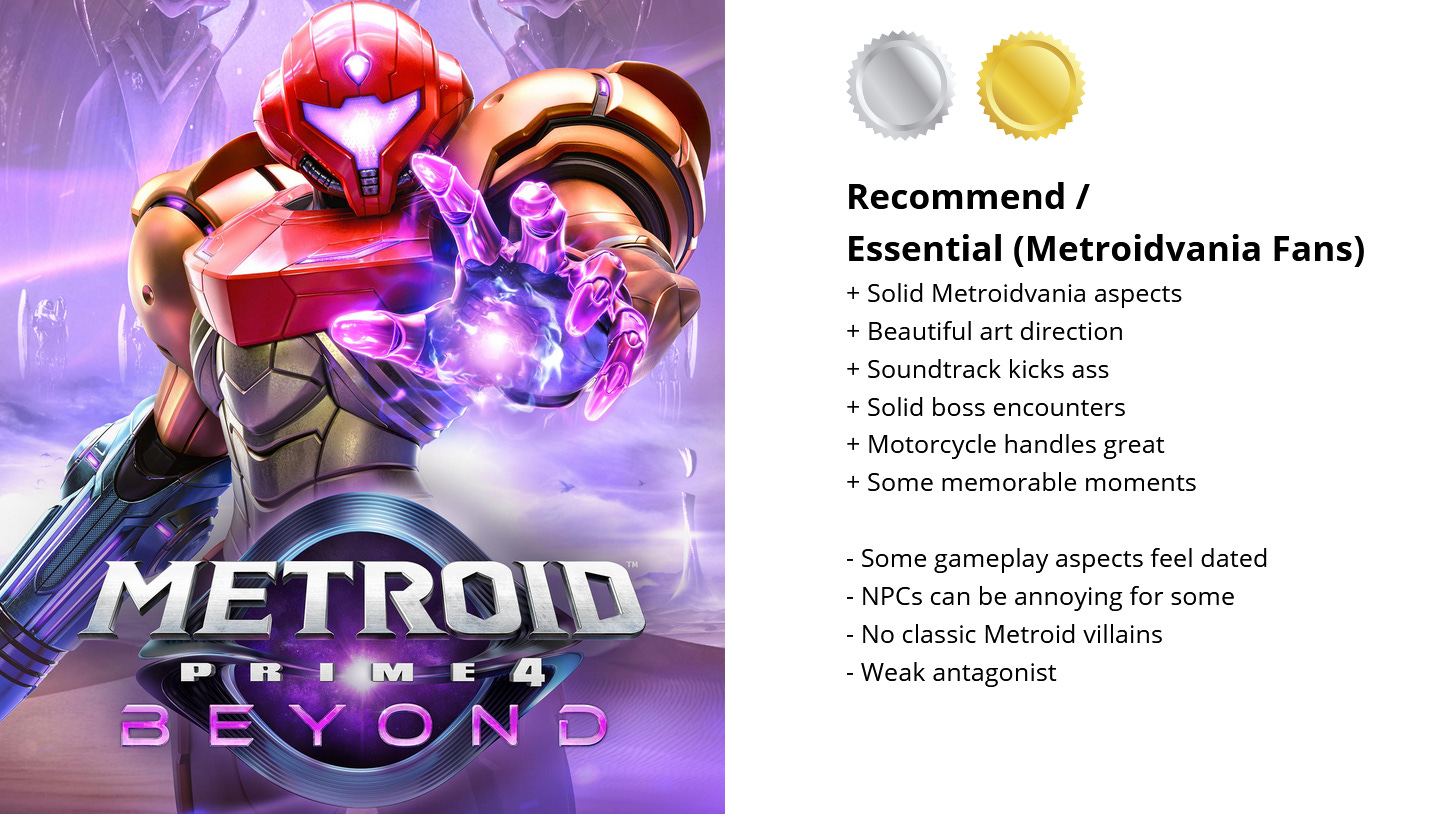 Ultimately, I feel like this game has two stories. If you’re a massive Metroid or Metroidvania fan like me, I think this game is an absolute must play title and deserves the Essential Gold medal, as I feel it’s something fans of the genre have to play. However, I will also give it a Silver Recommended medal to gamers who are newcomers or just like the series, rather than those who love it. What we have here is a solid Metroid game with some really cool moments, awesome boss fights, and a killer soundtrack, but it’s mixed with subjectively polarizing side characters and what feels like 2010s ideas. It’s definitely a game I loved every moment playing, but it just misses the mark of reaching the heights of the series the way the original Metroid Prime, Super Metroid, and Metroid Dread did. However, even if it doesn’t hit those highs, you still have another great entry to my favorite video game series, and we get another adventure with one of gaming’s most iconic women. Also, you have to listen to the Volt Forge theme, seriously, it’s addicting.