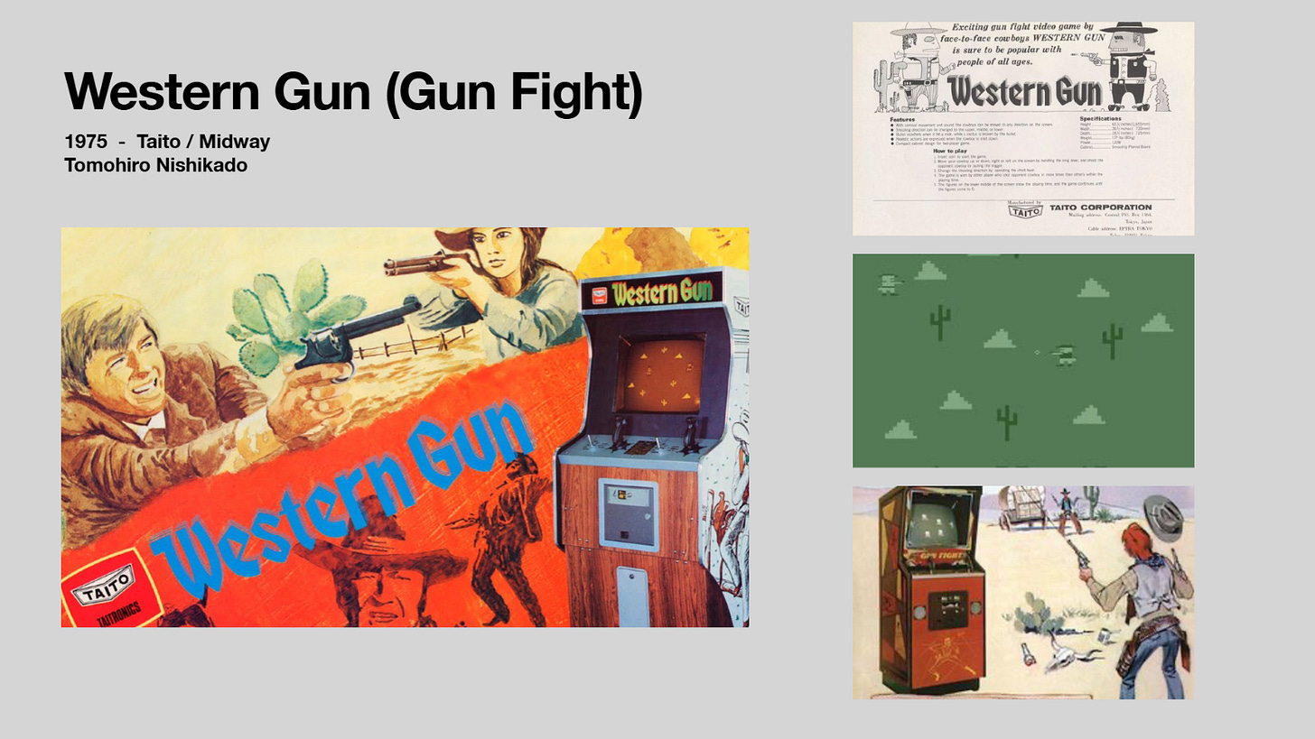 Tomohiro Nishikado is back, adding another gem to his portfolio, Western Gun. It’s a simple game with a simple concept, but revolutionary for the time. You have two cowboys dueling. As a result, this is the first game credited with human-to-human combat. Like TV Basketball, Nishikado pushed for more realism and worked hard to have the graphics show sprites resembling cacti and human characters. The North American version was handled by Midway, who improved the graphics by using a microprocessor for the cabinet, a first in gaming at the time.