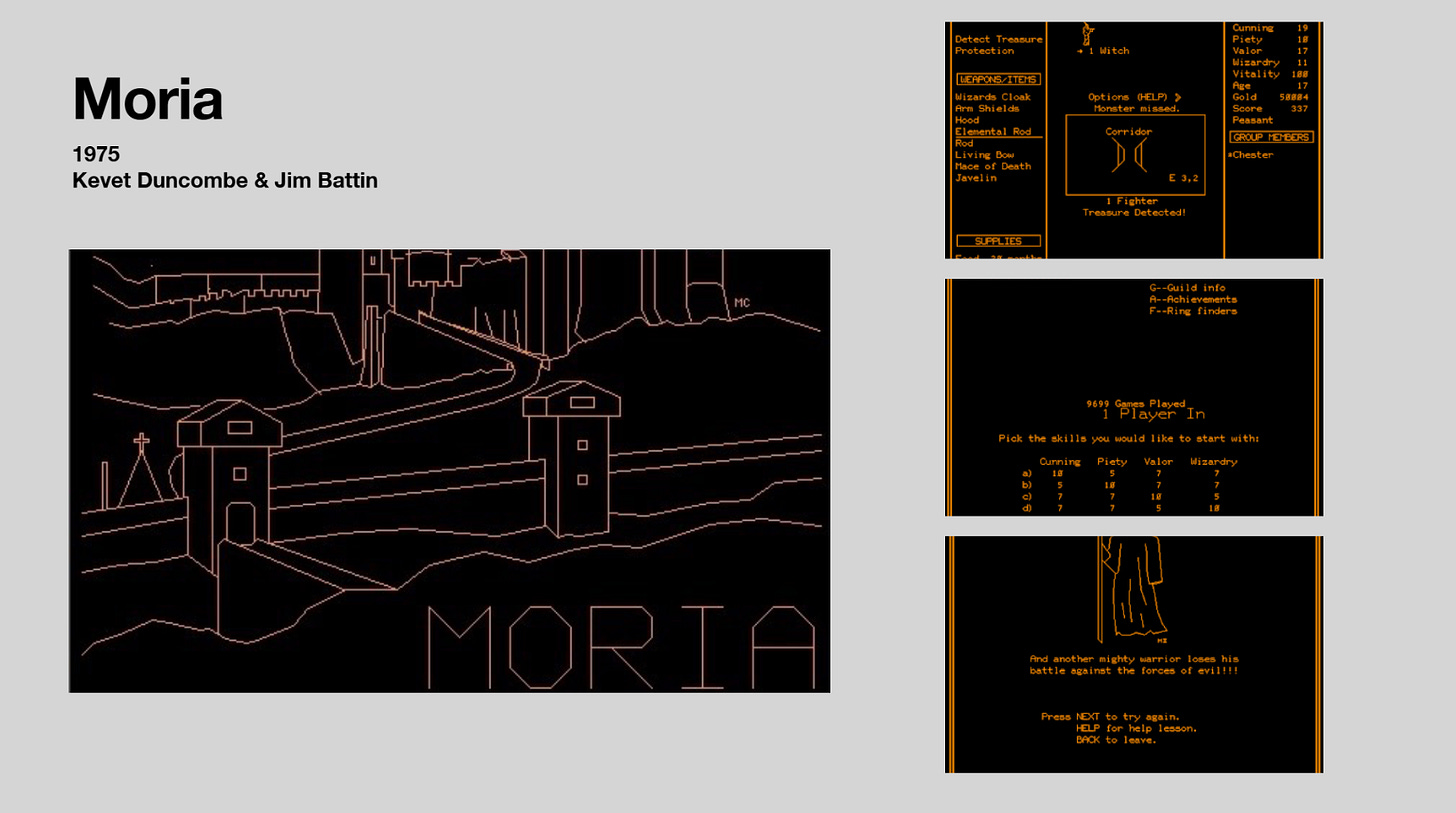 Yet another PLATO system dungeon crawler, which was heavily inspired by dnd. However, in this one, you can have multiple players journey together through the generated dungeons; so, in many ways, this was an early example of today’s MMO RPGs. The game’s name is taken from The Lord of the Rings’ infamous setting but is mostly based on Dungeons and Dragons. Several updates were made to the game over the following decade, including adding color.