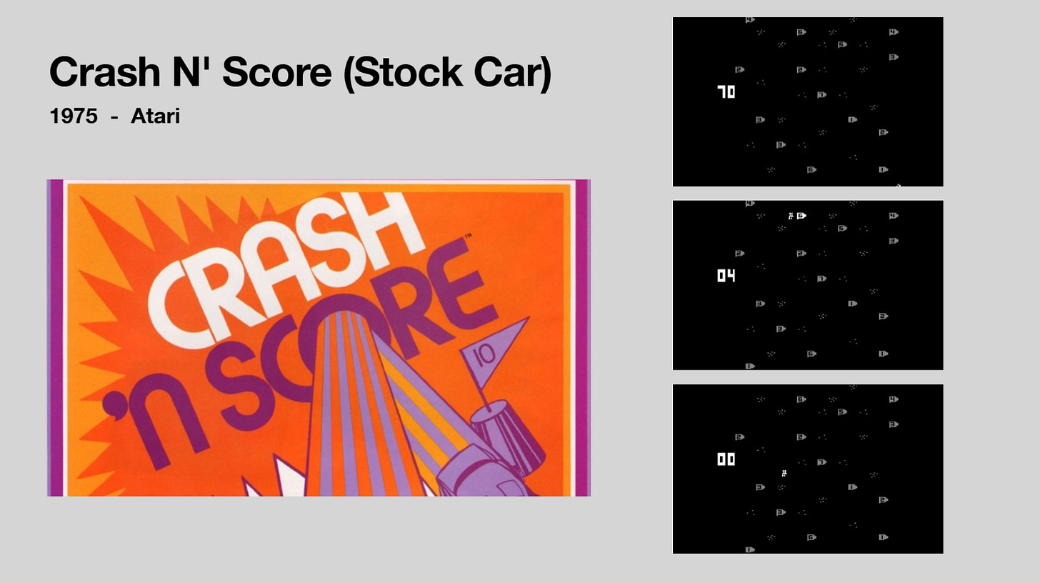 One of the more popular arcade titles of the year, Crash N’ Score is a demolition derby game in which players crash into other cars and flags to score points. While simple, it proved a nice success for Atari and continued to equate the brand with quality and fun. The game was titled Stock Car in Europe.