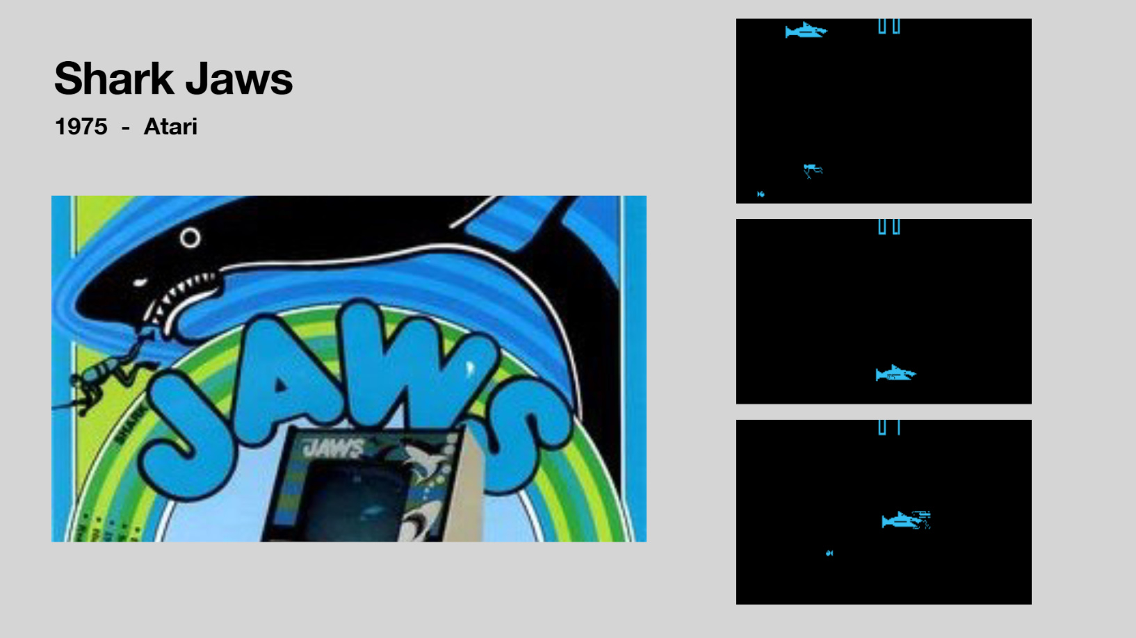 Shark Jaws was inspired by Sega’s 1972 electromechanical game Killer Shark and the recently released blockbuster hit Jaws. Ironically, Killer Shark was briefly shown in the movie. Originally, the game would be a licensed game of the movie, but Bushnell couldn’t get the rights, so he worked to tie it into the movie without making Universal mad. The marketing and text for the game purposely focused on the word Jaws to make it seem like it was based on the film. Bushnell even published it under a subsidiary of Horror Games, just in case Universal decided to sue him. The game has you play as a fisherman, trying to catch fish while avoiding a shark. It was a big hit and even appeared briefly in another fish horror movie, 1978’s Piranha.