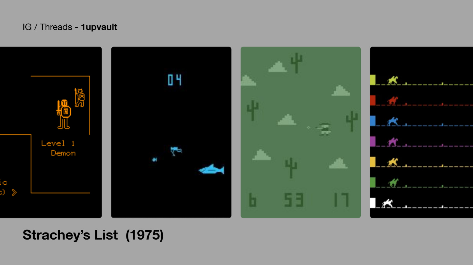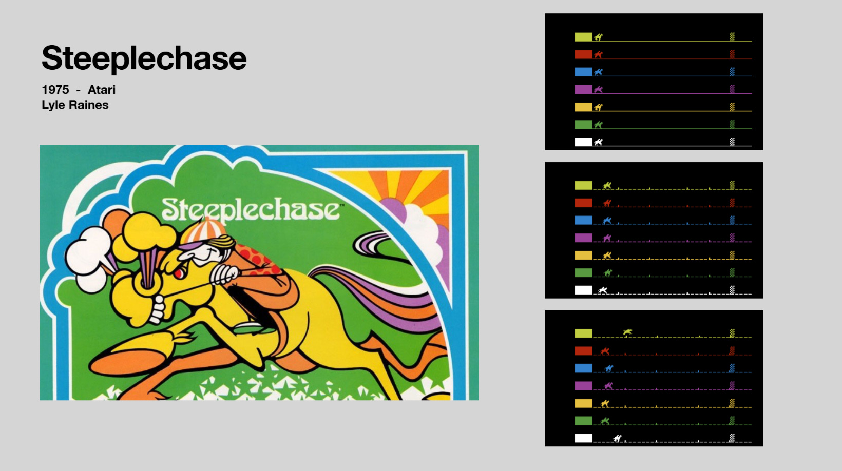 Atari’s breakout year continues with Steeplechase, a horse racing title in which up to six players jump obstacles to win the race. Much like Crash N’ Score and Jet Fighter, the game may look basic today, but it was part of establishing Atari as the force in American arcade gaming. It became popular enough to be released in other countries, becoming a hit in Japan.