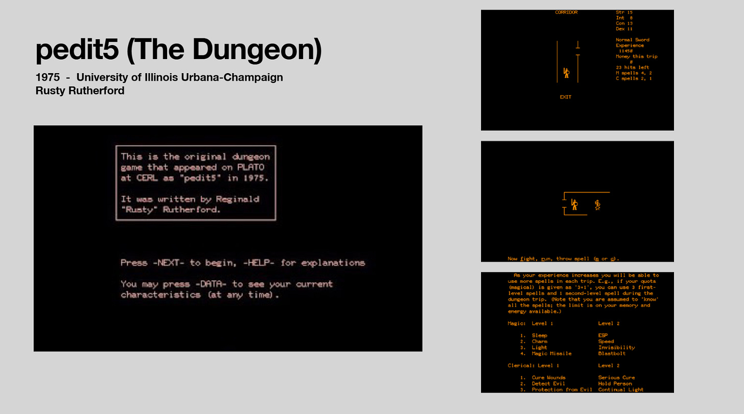 The first example of a dungeon-crawling adventure game and of the roguelike genre is Pedit5, also known by some as The Dungeon. The player has to deal with randomly generated encounters with monsters or treasure and decide what to do from there. You can either cast a spell or flee against a monster. The legacy of Pedit5 can’t be understated, as it’s one of the first role-playing games and a great example of moving video games beyond just scoring points.