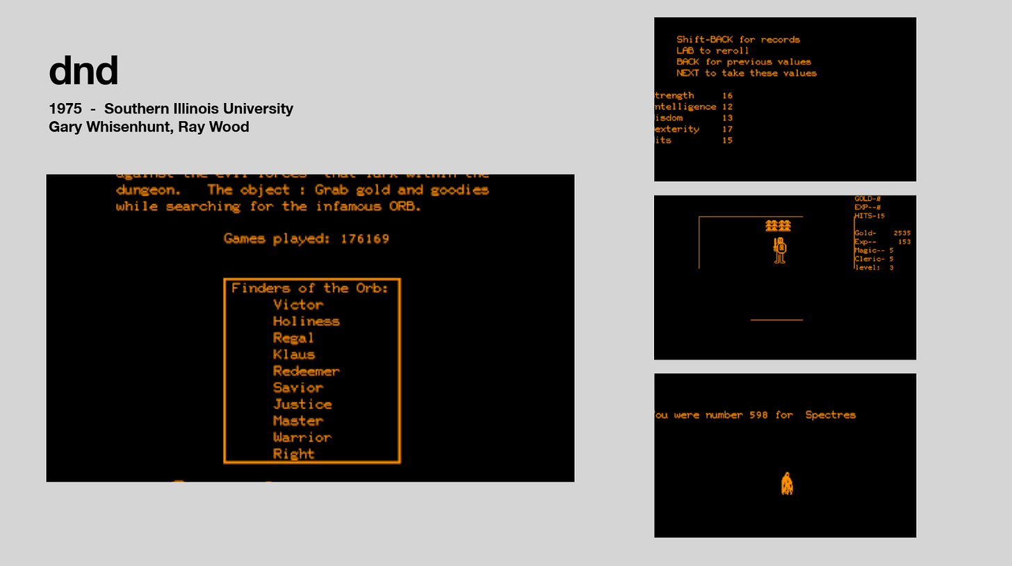 The game dnd is essentially the first video game based on the popular tabletop game Dungeons & Dragons - licensing fee not charged. Your goal is to obtain the grail and orb, two treasures. You advance through a multi-level dungeon, fight enemies, and get new abilities as you progress. It’s also the first game to have bosses, a major enemy variant that has become commonplace in video games. You also can visit past levels and leave the dungeon, making it one of the first games with a non-linear structure.