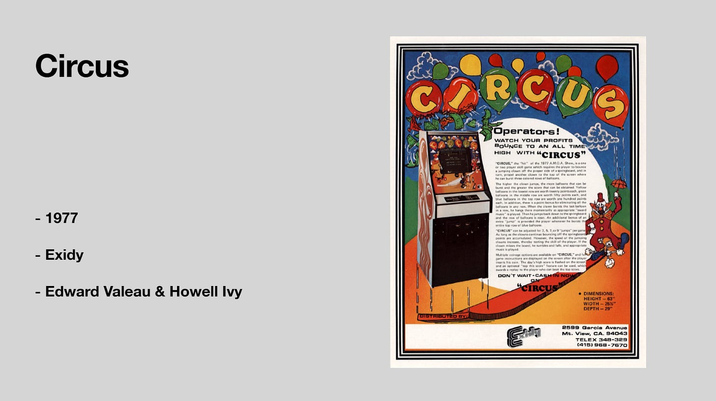 Circus plays similar to the previous year’s Breakout. The goal is to get your character, a clown, to be able to hit balloons and make them disappear. The game build on the success of Breakout and became a hit in the arcades. It also showed that in an industry filled with copycat clones, you could be inspired by a game and put your own spin or new paint on it, without having to shamelessly copy everything.