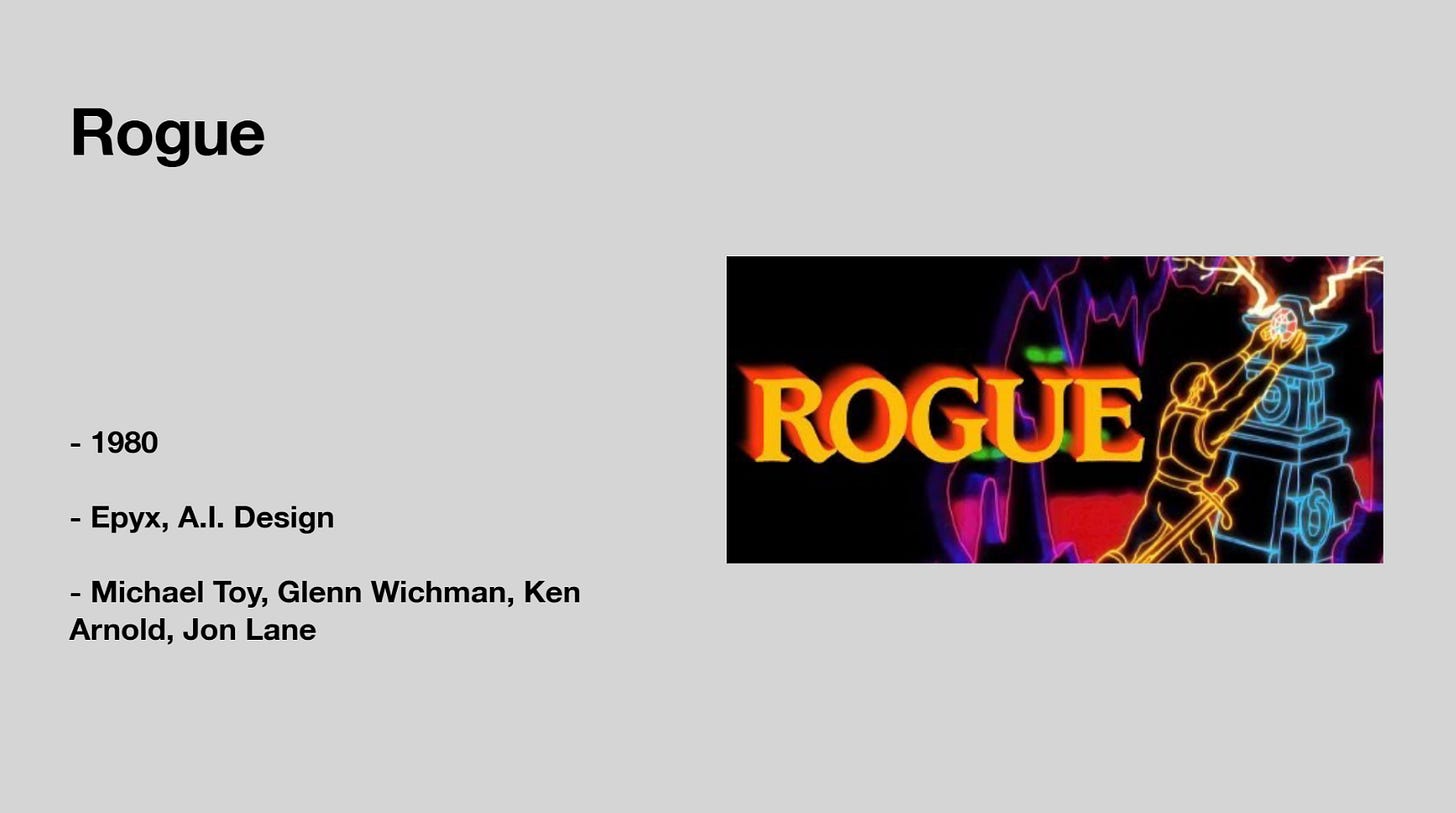 Becoming popular with college students at the time, Rogue is a dungeon crawler that has players traverse enemy filled dungeons looking for weapons and treasure. As an adventurer you had to get to the bottom most level of the dungeon to retrieve an amulet. It was played with an overhead view rather than the text-based games most adventure titles of the time used. The game provided a template for the procedural generated concept and established the roguelike genre.