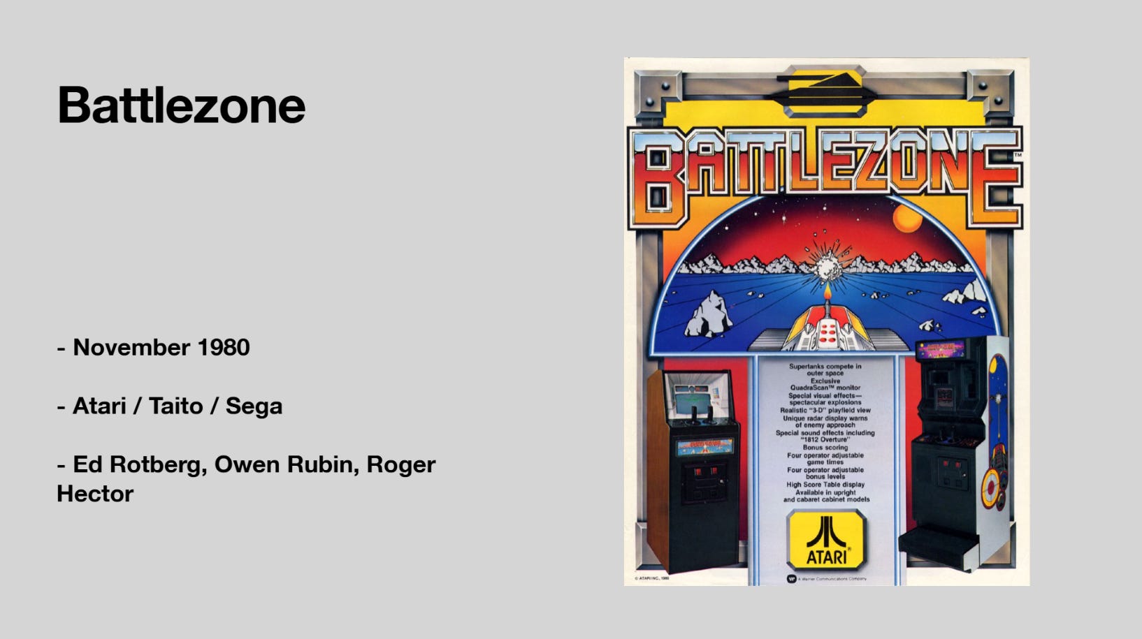With wire frame vector graphics, drive around a tank using the arcade cabinet’s two joysticks to traverse and take down obstacles. The game was a commercial success and received some awards from early gaming magazines. The 3D first-person vector styled graphics has helped to have some call it one of the first virtual reality games. The tank combat game earned a legacy as one of the premier early titles in the industry, and helped influence many future games.